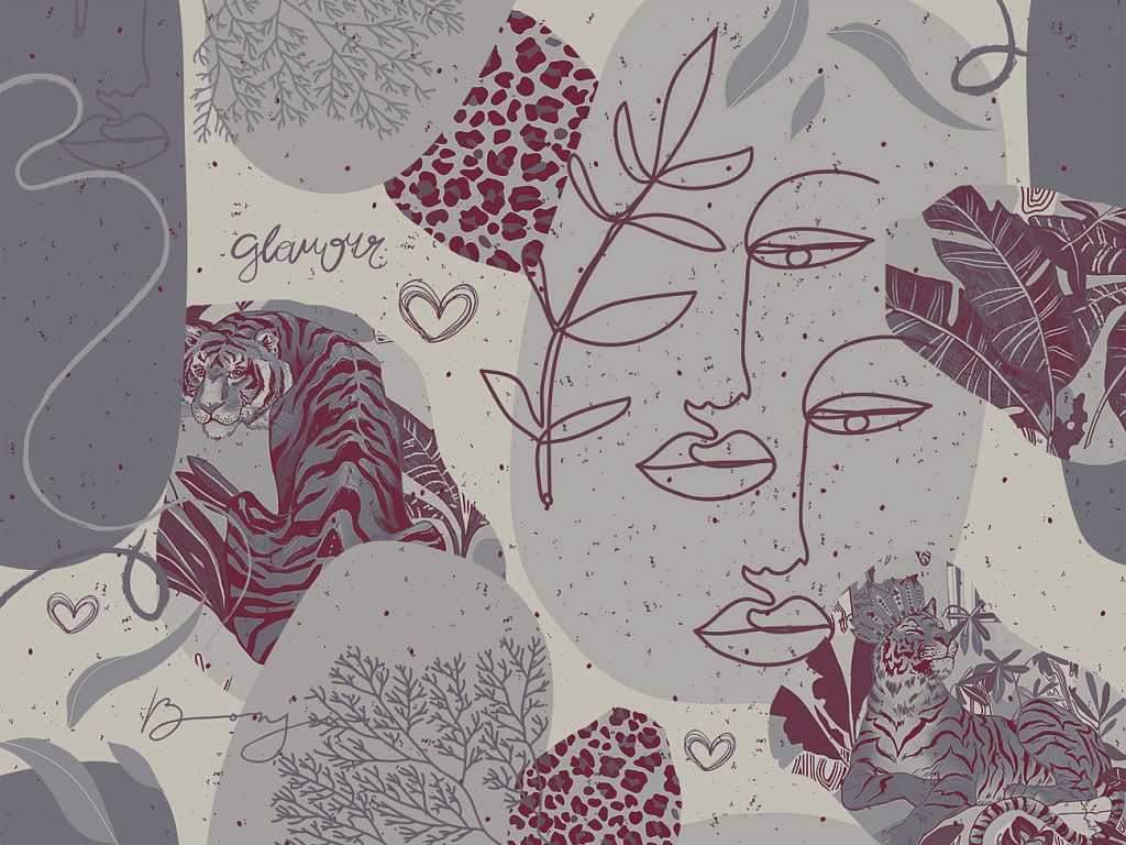 - Рисунок: Тигр, Абстракция, Надписи, Листья